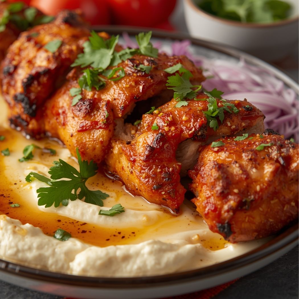 - Servir à l'assiette en ajoutant la sauce tarator sur la viande et accompagner ce plat de hommos (purée de pois-chiches) et de baba-ghannouge (caviar d'aubergines).